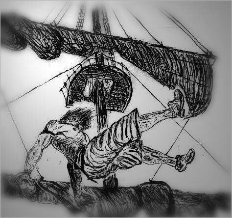 Die Waffen und die Munition des Handelsschiffes brachten wir zu uns rüber an Bord, ebenso alle Lebensmittelvorräte die wir auf dem Handelsschiff finden konnten. Auch alles Geld und allen Schmuck sammelten wir ein, oder nahmen ihn direkt den Seeleuten ab. Dann zündeten wir das Handelsschiff an. Wer dort noch an Bord war, rettete sich in kleinere Ruderboote, doch ihre Chancen die nächste Insel zu erreichen, dürfte wohl nicht sehr groß gewesen sein. Wir indes zogen es vor, erst einmal die Segel zu setzen und nach weiteren Handelsschiffen Ausschau zu halten, die wir überfallen und ausplündern konnten. So kam es, bedingt durch glückliche Umstände, daß wir in kurzer Zeit mehrere Handelsschiffe überfielen, die die verschiedensten Waren und Schätze über dem Meer trugen und dummerweise den gleichen Weg nahmen, den auch wir entgegensteuerten. Und allzu oft ertönte danach das fröhliche Piratenlied über dem nun totenstill gewordenen Meer, welches unsere Mannschaft mit größter Freude und voller Übermut aus feuchter Kehle sangen." da drehte der Klabautermann sich dreimal um seine eigene Achse ganz schnell um